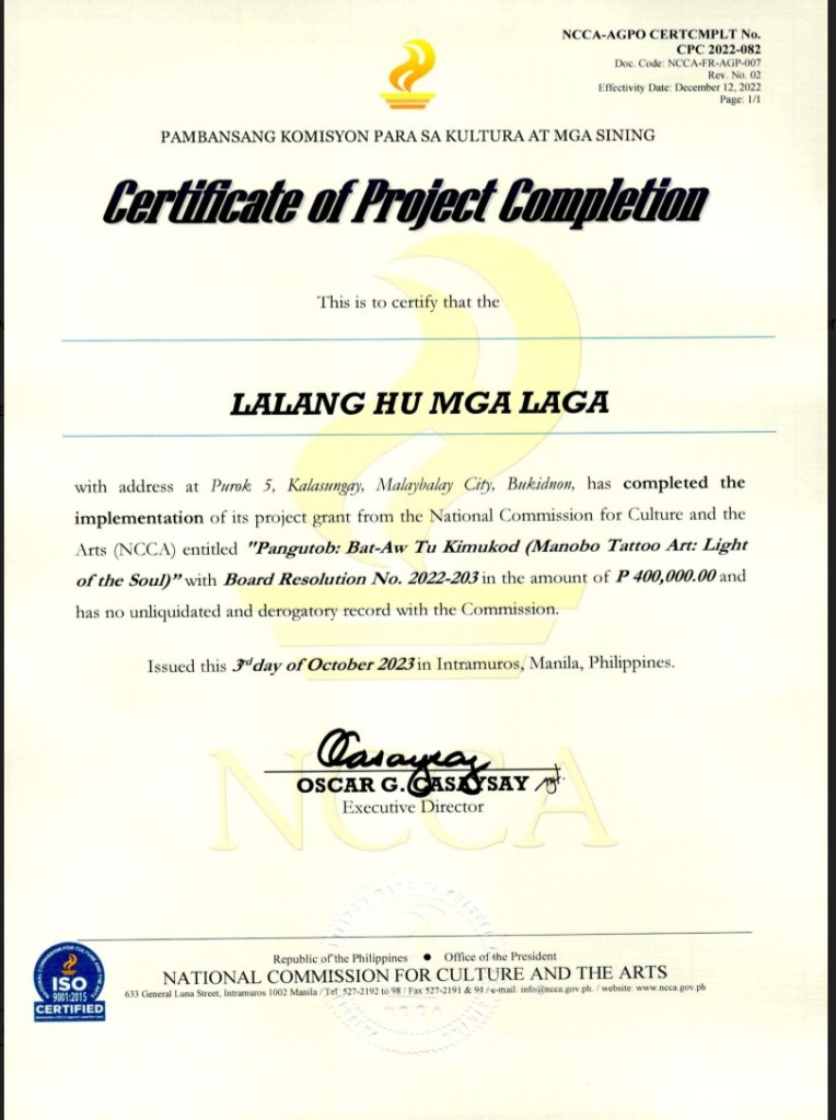 Ikinagagalak naming maging recipient ng tulong para sa proyektong Pangutob: Bat-aw tu Kimukod (Manobo Tattoo Art: Light of the Soul)